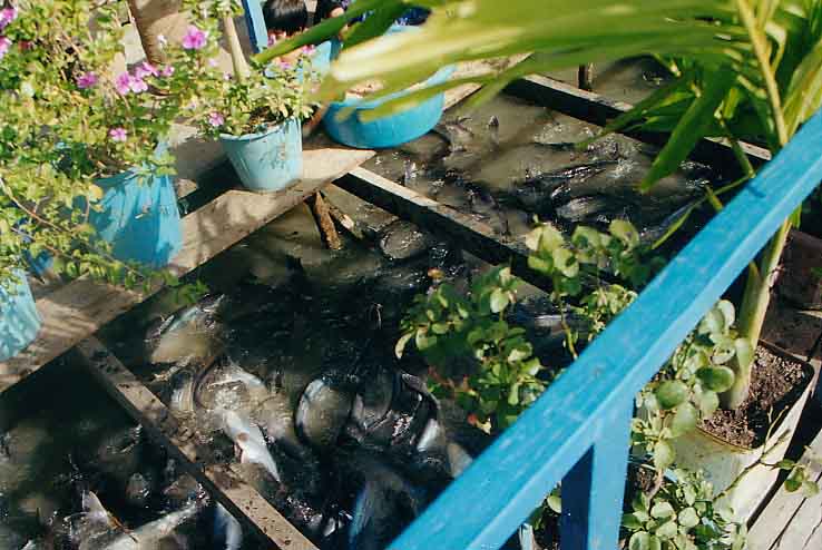 水上民家の付属設備、いけす。ナマズやライ魚の淡水魚が多いが、本来、海に棲んでいる魚も生息している。