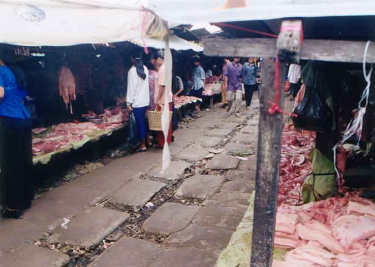 肉売場コーナー。路地は石張りになっているが排水がはない。
