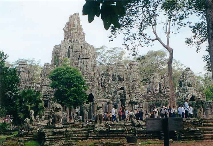 | アンコール・トムはアンコール・ワットの直ぐ北にあり、周囲に環濠と分厚い城壁を持った都城である。ワットは一つの寺院が環濠で囲まれているのに比べ、トムは王城をそっくり収容する大きな建造物で、城壁の長さが一辺3km、王宮、王宮前広場、閲兵テラス、寺院ほか付属施設が配置されている。(城壁内の面積は東京で言えば中央区位の広さがある)バイヨン寺院はアンコールワット竣工後に完成しているが、都城全体はワット建設より遥か以前から作り始めていた。3km角の縦軸、横軸に道路が通っているが、その交点にバイヨン寺院がある。トム全体が東向きに構成されているので、バイヨン寺院も正面は東向きである。(ワットの西向きはアンコール遺跡では特殊な配置である) |