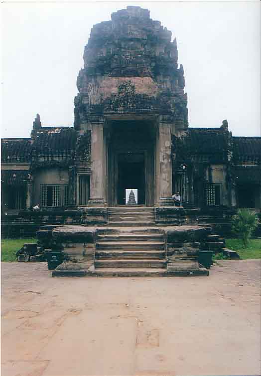 環濠外側の正面テラスから塔門テラスまで、来訪者は直線的に移動するだけであるが、非常に長い直線的移動に加えて、建築物の高さと、人間の視点のレベルの変化の組合せが高揚感を徐々に高め、演出が巧みである。日本や中国の次の空間までしか見せない手法に比べて、常に一番奥まで見え隠れさせながら通し見せる空間演出はまったく異なっている。この写真は西塔門から中央祠堂を象徴的に見る。