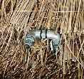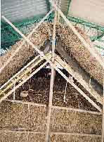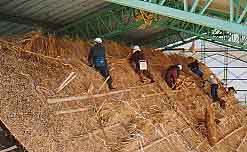 ![]() 22.マルキを跨いで両側から茅を葺き、頂部で編みこむ。 |