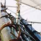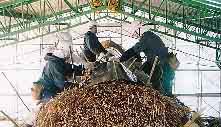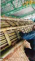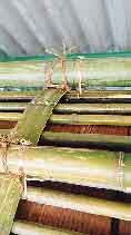 ![]() 25.茅の外側を杉皮で包み、その上から簾竹を被せ、棟の化粧をする。 |