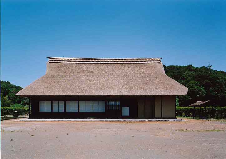 入母屋,右かって、上梁での規模:桁行き9間半、梁間4間、下屋桁規模10間x5間。東端(右側)にウマヤがあり、その部分が2階建てで、天井高を取るため入母屋の頂点が外側によせてある。そのため、屋根は左右対称でなく東側3尺分切り落とした形になっている。屋根にドレンチャーが3箇所、付いているが目立たないようにデザインしている。