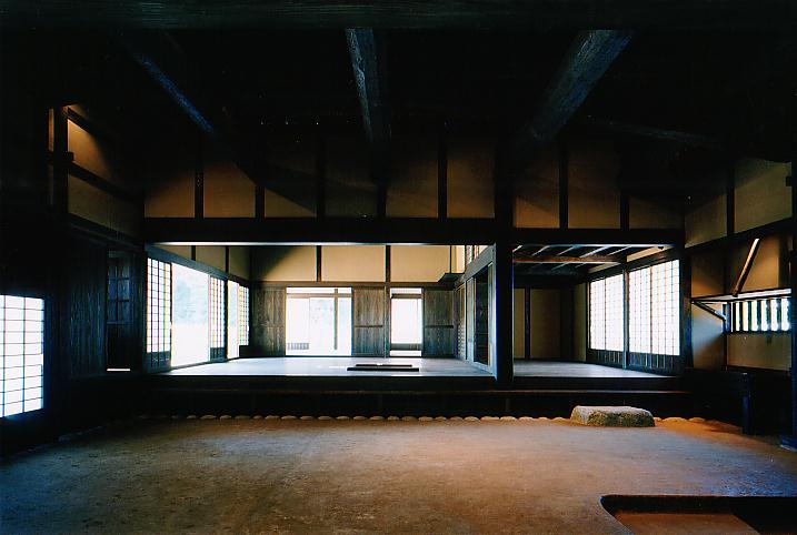 左端が大戸、隣が湯どの、正面左側、3間四方の部屋が座敷でいろりがある。右側の部屋はお勝手、両方の部屋共、土間境に建具はない。右端は水屋で、手前下に竈の堀込みが見える。土間が広く馬屋部分まで含めると23.5坪ある。