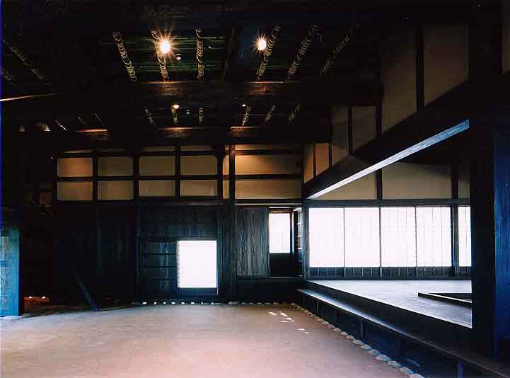 大戸右側はゆどの。手前竃の大釜から湯を運んで浴びた。小壁(建具より上の壁)は貫表しで、一般に土間廻りはこの仕上げである。右の座敷の小壁は壁が厚く塗ってあり、横に通る貫が見えていない。大黒柱、差し鴨居、段板は欅材。