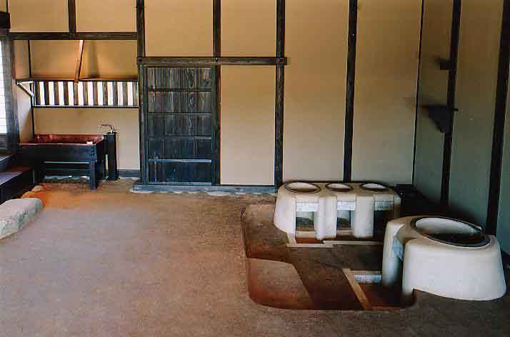 大釜と3連の小さな釜用のへっつい(カマド)。日常は全部を使う事はなかったが、人寄せの時などは全部を利用した。