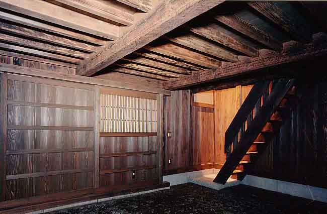 扉は3重で、土戸2枚と、内側に腰付格子戸がある。左側に見えるのは内側土戸の裏側。常時は格子戸を使用して板張り部の下に見える穴から鍵棒を入れてその右のサルを落として戸締りをした。農家の蔵の1階は土間が多い。