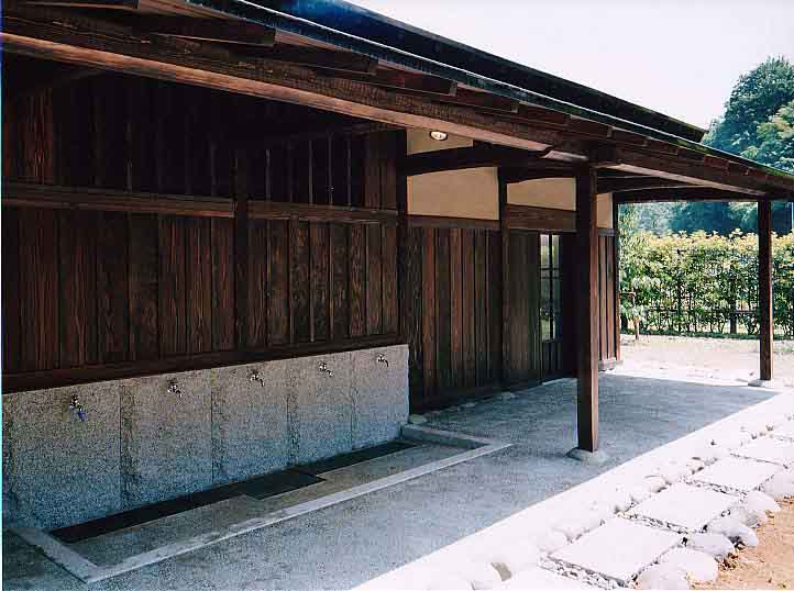 この洗い場で農作業後に手足を洗ったり収穫物や道具を洗ったりする。奥に見える出入口は厨房で煮炊きの下拵えをしたりする。